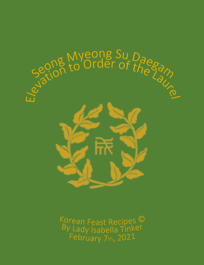 Both of the recipes used are excerpts from a virtual Korean feast that I created for the elevation of Seong Myeong Su Daegam to the Order of the Laurel in the Kingdom of Meridies that will happen on February 7th, 2021. The feast is based on an elders 61st (Korean) or 60th (western) birthday celebration known as 환갑 hwangap. In SCA period Korea, there was a shorter life expectancy, so hwangap was a celebration of longevity. Some of the meal aspects of hwangap are similar to 돌잔치 doljanchi, a baby’s first birthday celebration, a major milestone. The two types of rice cakes that are pictured are essential to a traditional Korean birthday.
