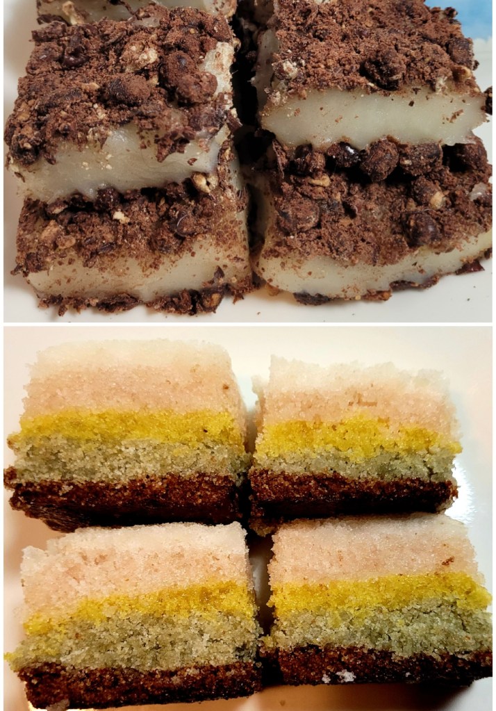 Muijigae-tteok, also called saekpyeon (colored rice cake) or osaekpyeon (five colored rice cake), is representative of obangsaek, which represents balance and harmony in the universe. The colors of each layer are brown (black), green (blue), yellow, pink (red), and white. Each of these colors represents one of the five elements: fire, water, tree, metal, and earth. Each also represents one of the five directions: north, south, east, west, and center. Muijigae-tteok is also commonly made with three colors rather than five. Wet rice flour made from short grain rice is used to create this rice cake. Food coloring is commonly used in the Known World.